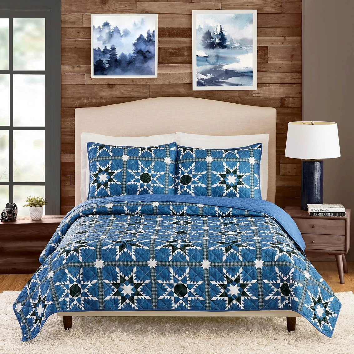Available in a festive Blue Starburst pattern, this 2-piece Holiday Quilt set from 1977 Dry Goods includes a quilt and 2 standard pillow shams. The quilt comes in Full/Queen and King sizes. Model: A06522BLN.
