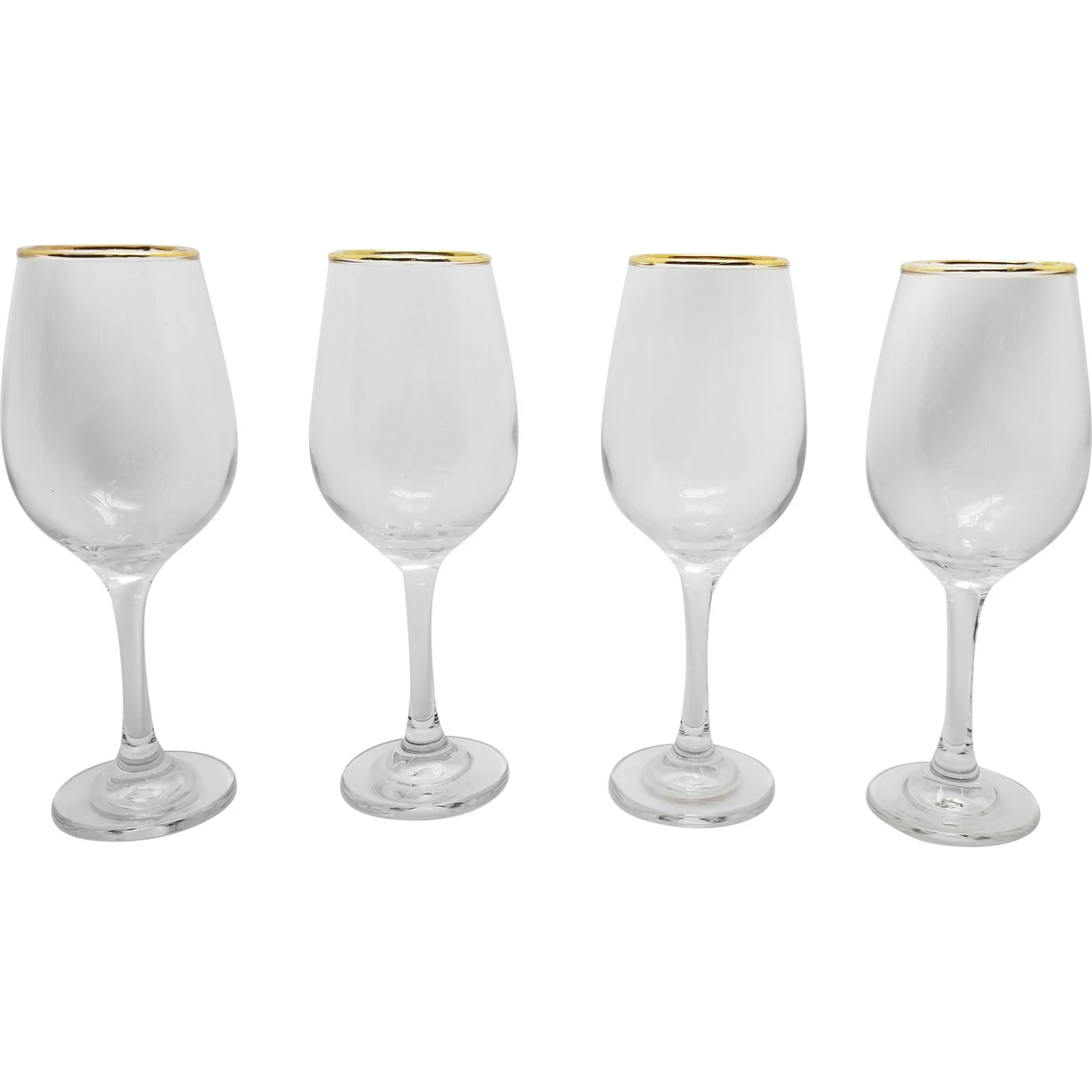 A sophisticated twist to your traditional wine glasses, the Gibson Home Imagination 14 oz. Wine Glass 4-piece Set is perfect for everyday entertaining and special occasions. The glass set features a wide mouth and a smooth base for easy use and handling. Each glass has a sparkling gold rim that adds a modern and elegant touch to any table. Dishwasher safe. Top rack only. Model: 135964.04.