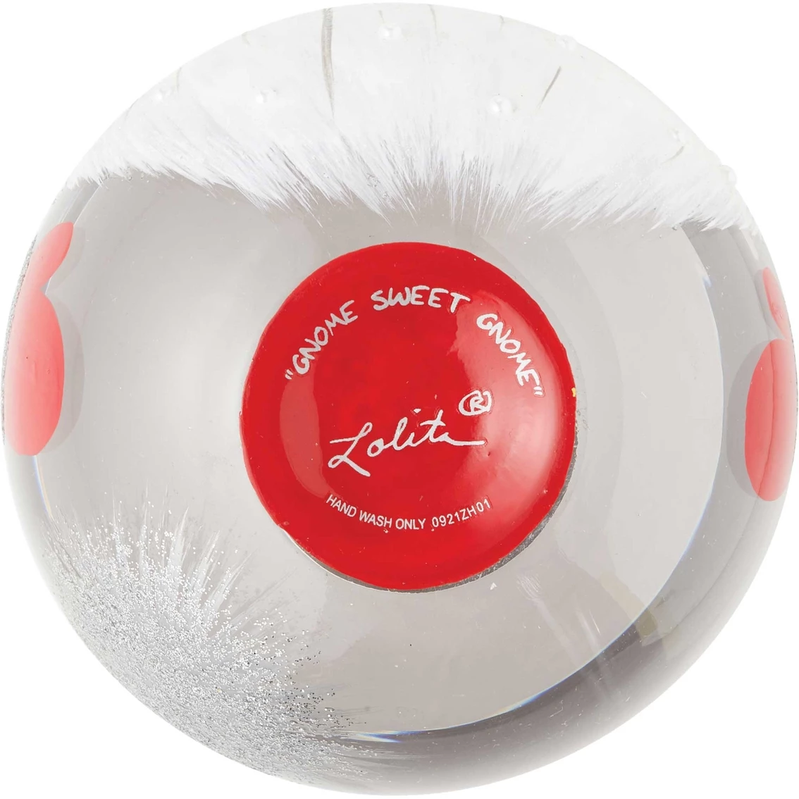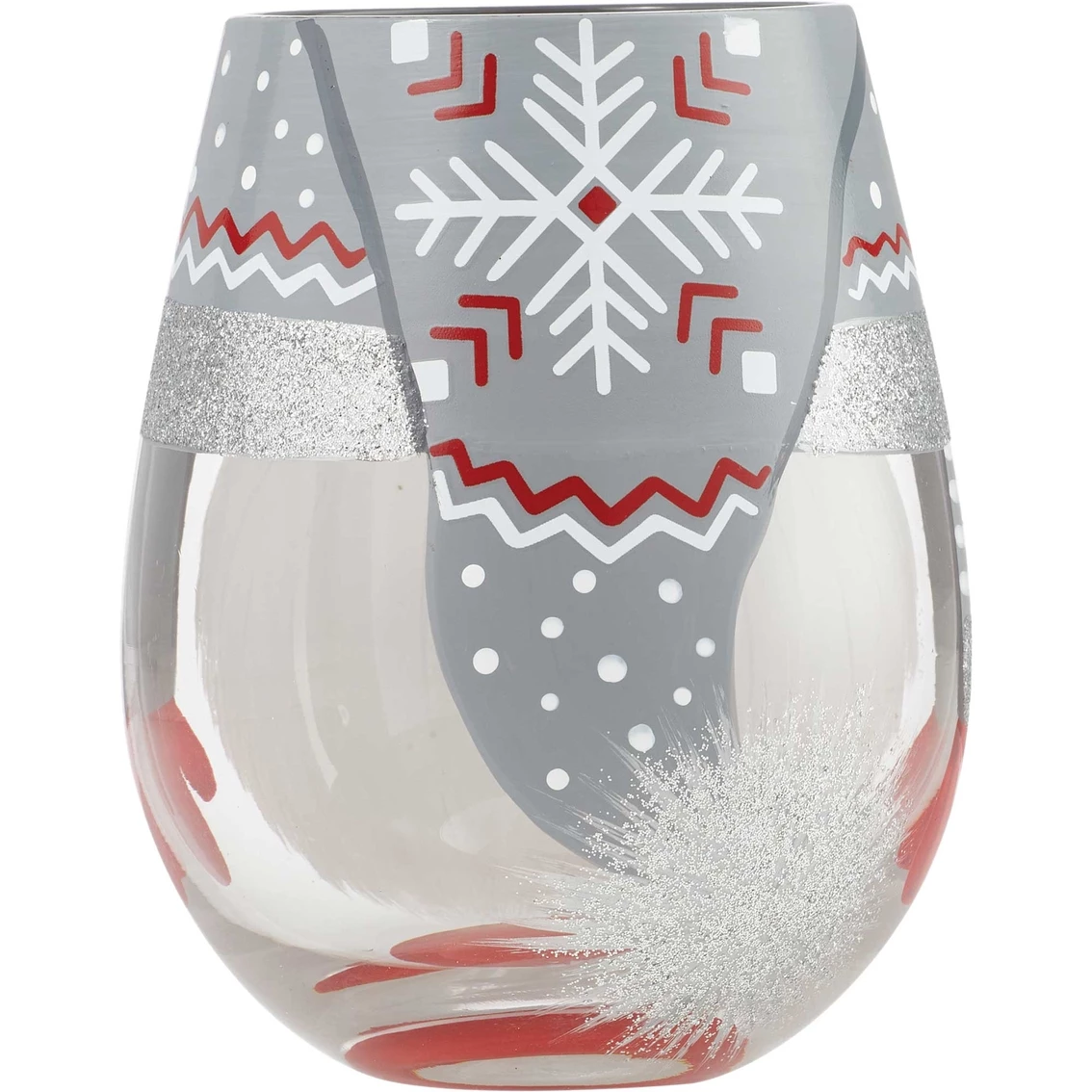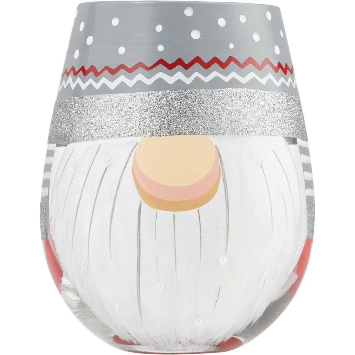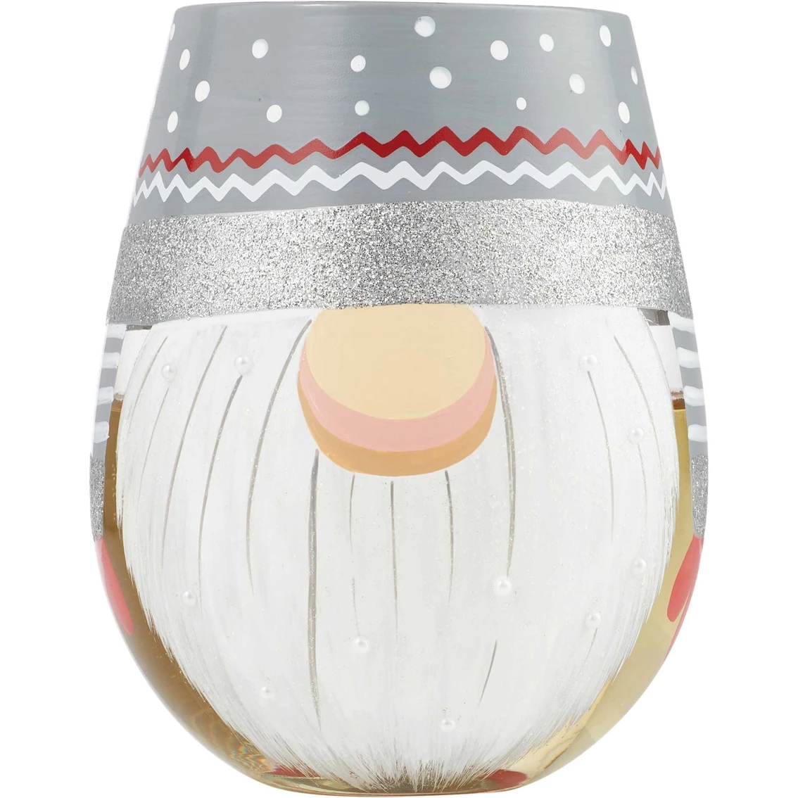 This cheerful 20 oz. stemless wine glass from Lolita is entitled Gnome Sweet Gnome and will warm you up on the coldest winter day. A hooded gnome whose only visible facial features are his nose and beard wears a glittery Santa hat with red and white pattern. Model: 6011244.