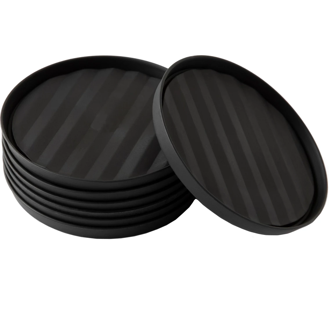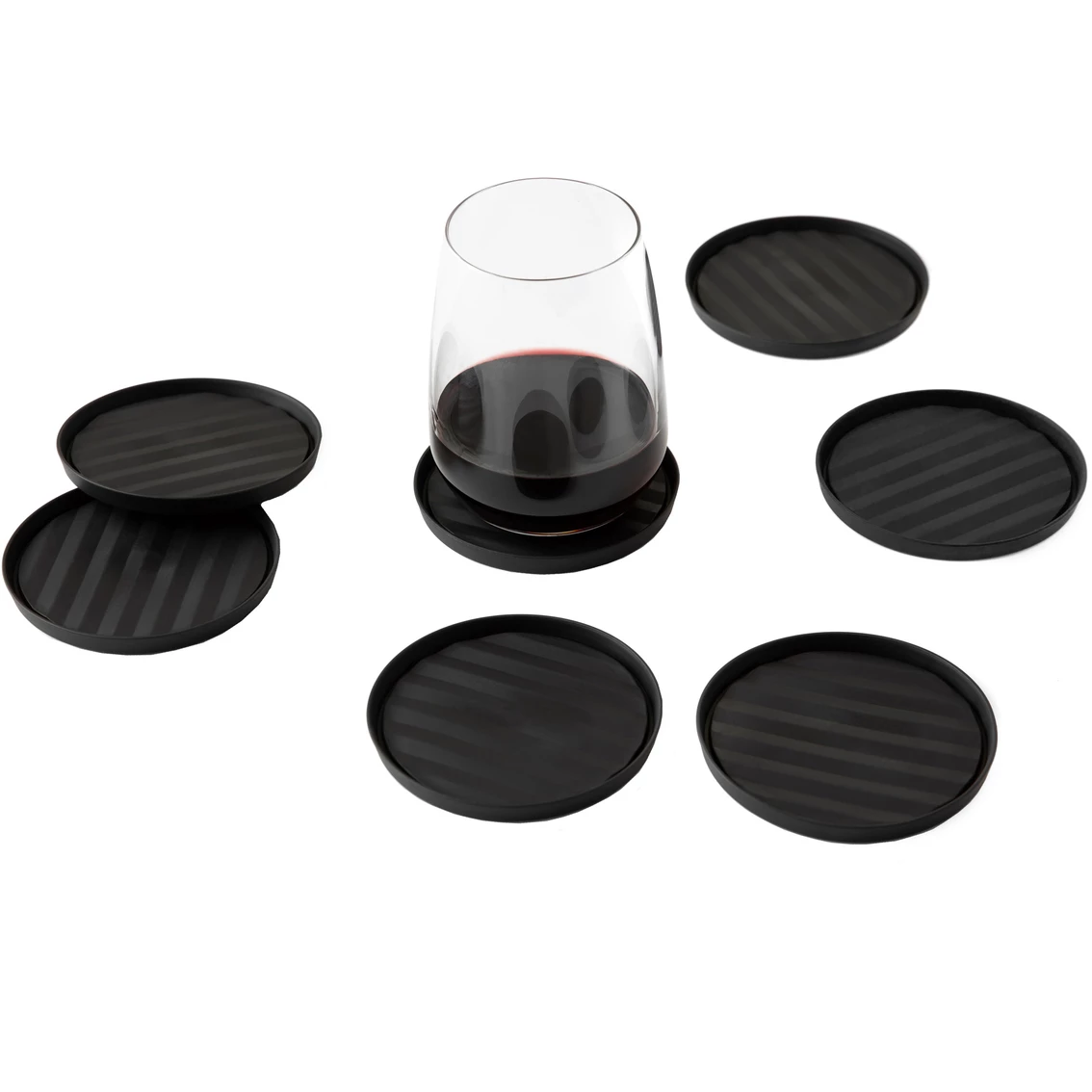 Set includes 8 coasters. Designed to catch all condensation from Bottles and glasses, The coasters help protect your tables. Textured pattern prevents coaster from sticking to your glasses. The coasters are 3.75 inches in diameter, fitting most bottles and glasses. Dishwasher safe.