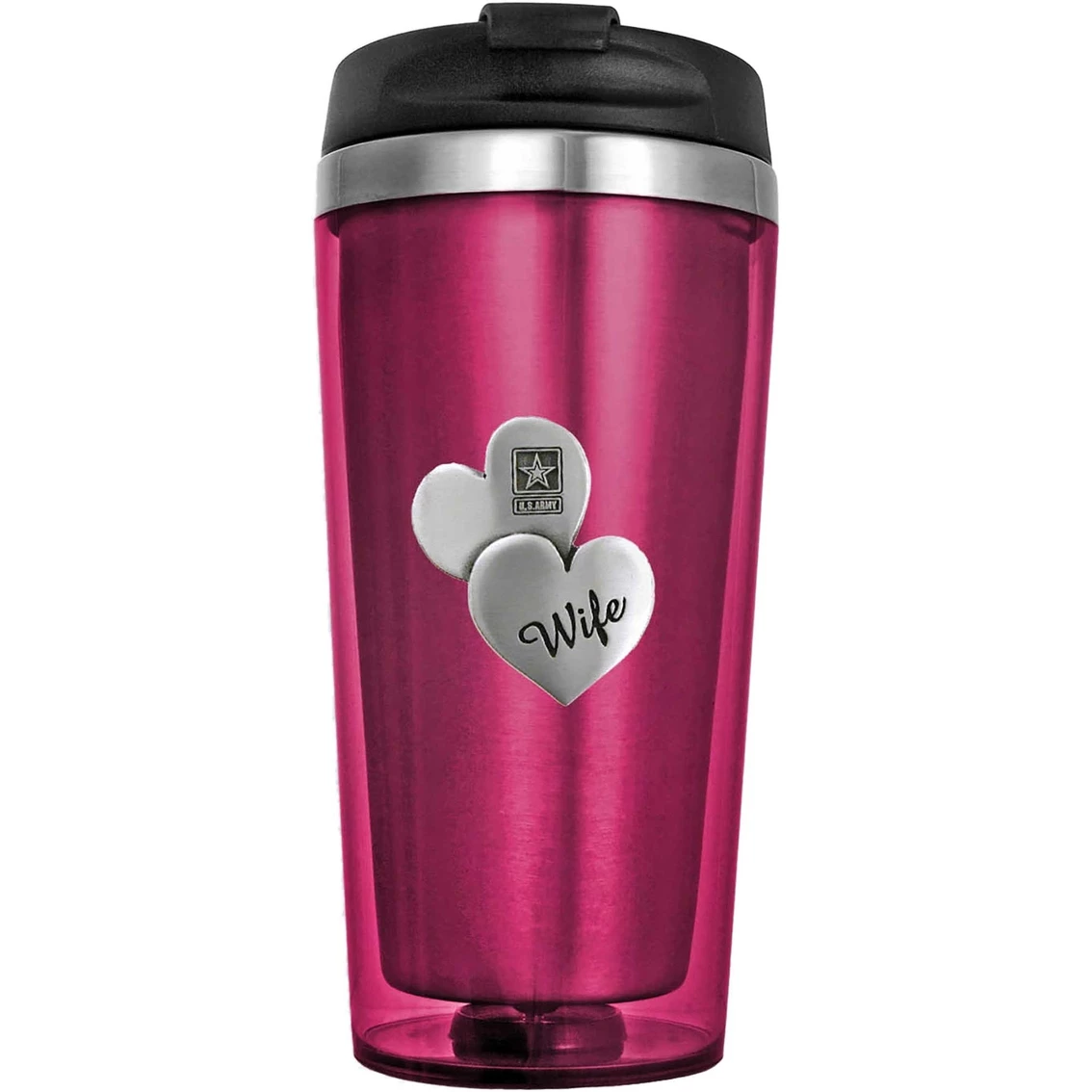 This 16 oz. travel mug with hand crafted pewter crest has a spill-resistant lid. Stainless Steel inside, bright Acrylic shell outside. Pink mug from Sparta features two hearts, one with Army Logo, the other with “Wife”. Model GS63731PK.