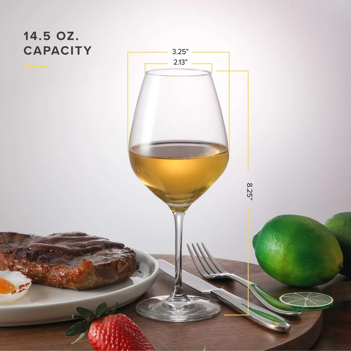 Table 12 White Wine Glass Set offers six 14.5-oz. white wine glasses to enjoy any white wine varietal. Quality designed to withstand heavy use in high end restaurants, luxuriously clear for any bar top and matches any dining table decor at home, a versatile addition for any formal or casual place setting. Each piece is manufactured with European lead-free crystal that offers clarity and break resistant longevity. Dishwasher safe. Made in Slovakia. Reinforced packaging with recyclable corrugated cardboard. Model: TGW6R30.