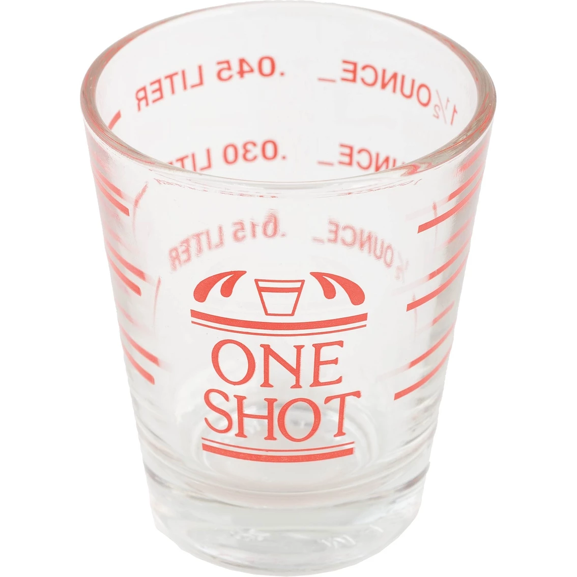 The True Fabrications Measured Shot Glass has indicators printed directly on the glass for .5 oz., 1 oz., and 1.5 oz. increments. Product: 400.