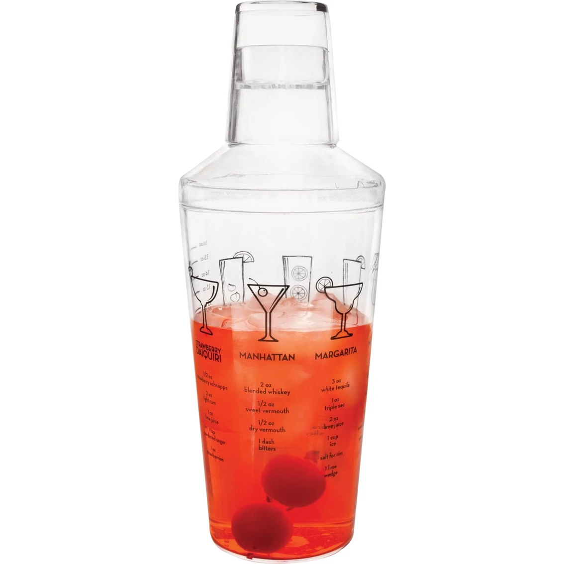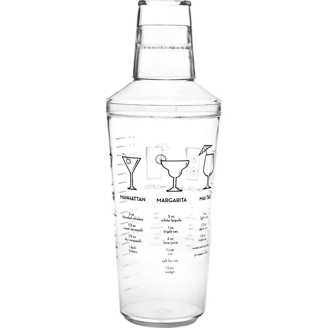 Pre-printed with both recipes and ounce measurements, the True Fabrications Plastic Recipe Shaker makes creating your own cocktails at home easier than ever. Printed with ounce markings up to 16 oz. and with 7 common drink recipes, the set includes the shaker, a strainer and a cap. Product: 2882.
